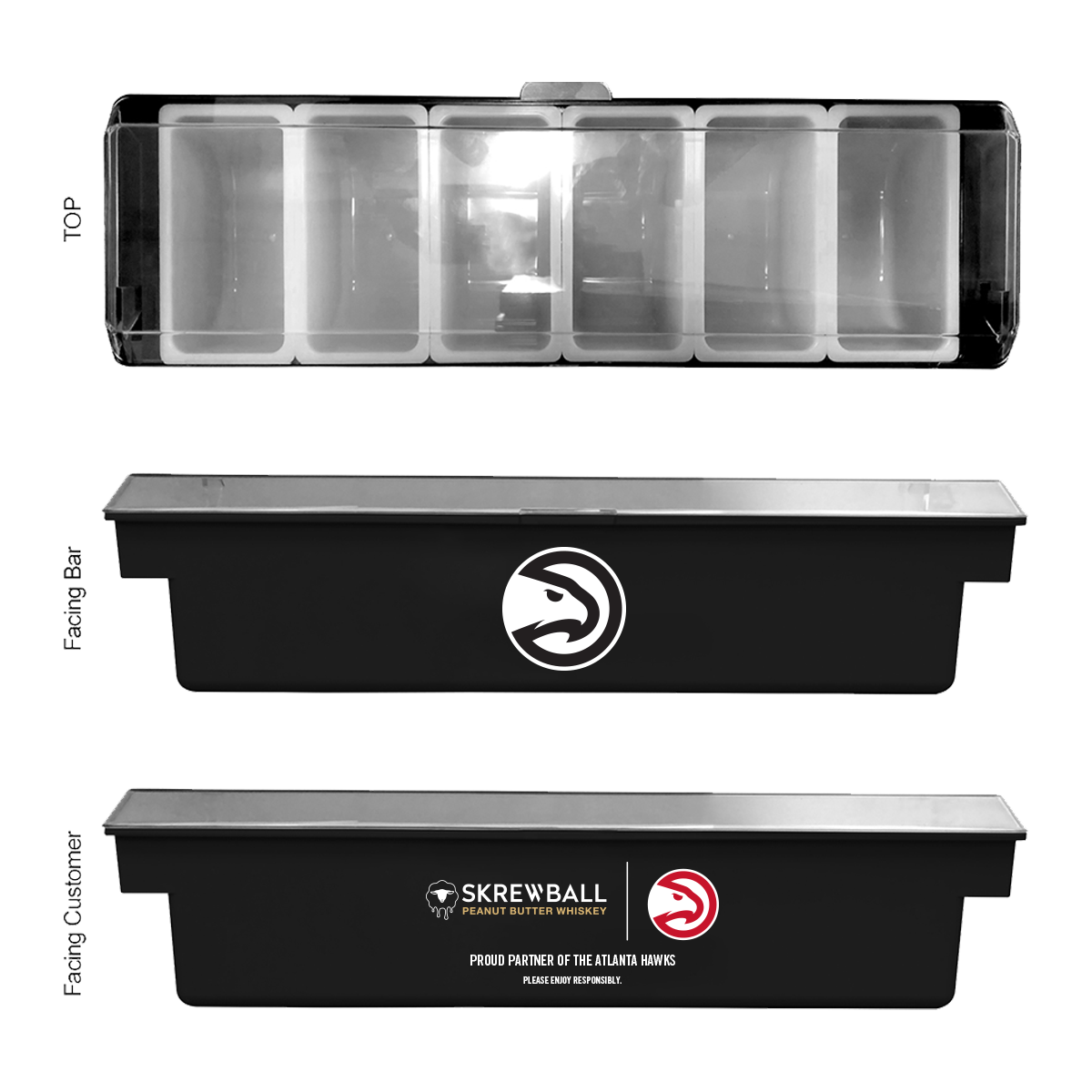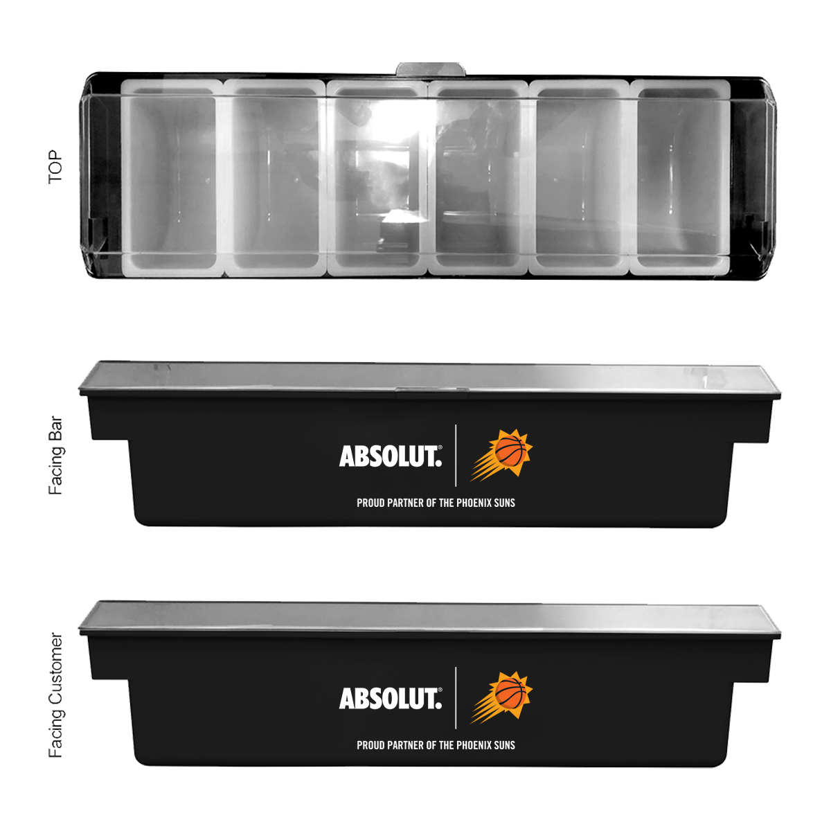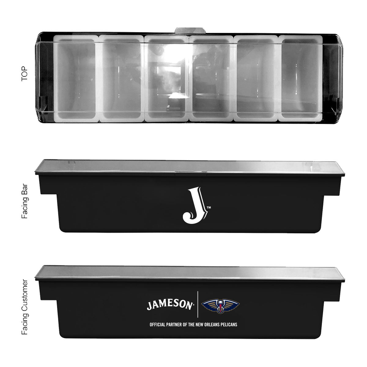 A condiment caddy with a black base features a clear-hinged lid and six removable compartments. It is durable and easy to clean, great for the food and bar industries.